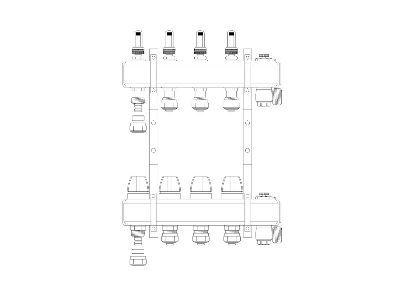 wieszak – 2 szt., zaworek odpowietrzający -2 szt. korek -1” – 2szt., przepływomierze 0-3,5l/min lub 0-2,5l/min , zawory termostatyczne manualne do siłowników na powrocie o gwincie M30 x 1,5 ( ilość sztuk w zależności od ilości obwodów ) złączki 16×2 pex w zależności od ilości obwodów .