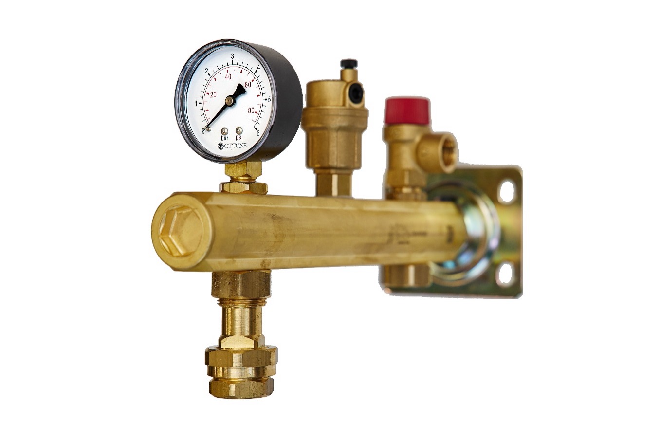 Umożliwia kontrolę ciśnienia. Służy do zamontowania naczynia przeponowego o pojemności do 25 l.Posiada korpus wykonany z mosiądzu CW617N , wyposażona w manometr i odpowietrznik automatyczny.