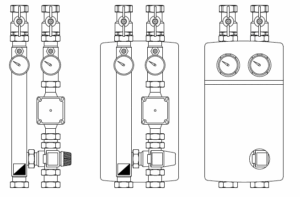 – Przyłącza od strony rozdzielacza: 2x G1½” nakrętka obrotowa – Zawór termostatyczny ESBE VTA 552 5/4″ KVS 3,5