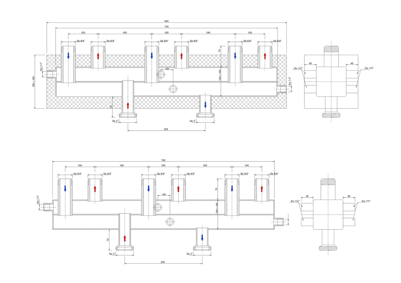 Rozdzielacz stalowy o przekroju kwadratu 100×100 mm. Stosowany w instalacjach grzewczych i chłodzących,przeznaczone są do szybkiego i wygodnego podłączenia trzech grup pompowych z przyłaczem 6/4″ i mniejszym. Funkcja seperatora powietrza poprzez zastosowanie zaworu napeniająco spustowego ,oraz odpowietrznika automatycznego . Polecany pomp ciepła , zbiorników buforowych, oraz kotłów na paliwa stałe. Wyposażony w izolację termiczną.