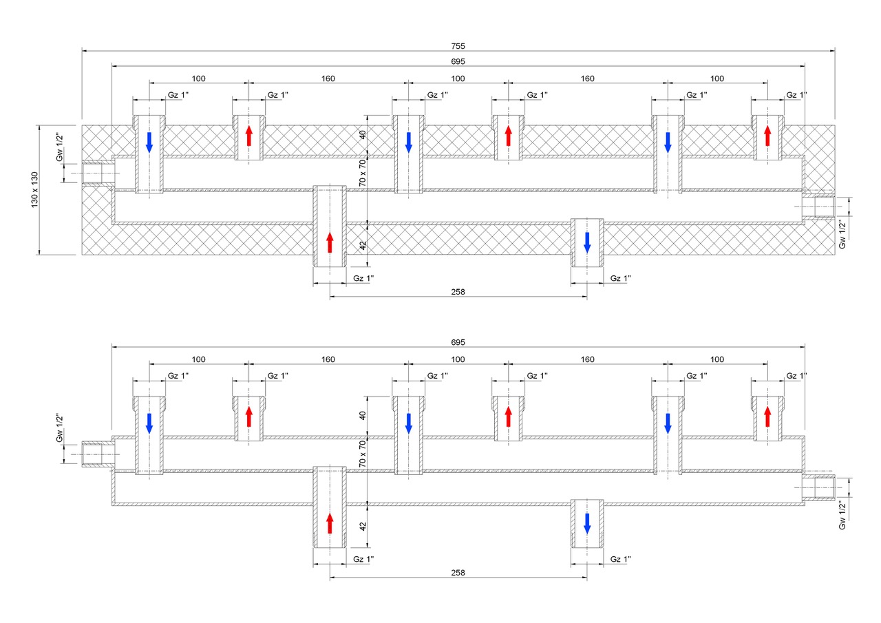 Rozdzielacz stalowy o przekroju 70x70mm , wejscie z gwintem zewnętrznym 1″ od strony zasilania ( strona pierwotna ). Trzy pary wyjść z gwintem zewnętrznym 1″ od strony instalacji ( strona wtórna) Możliwość montażu ( prawa , lewa strona ).